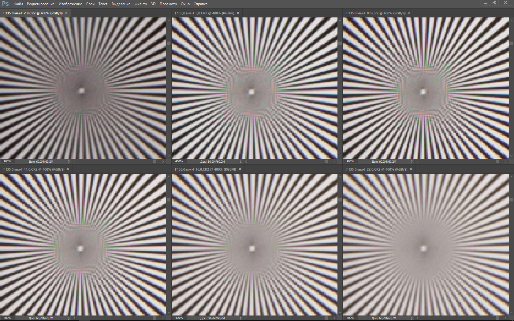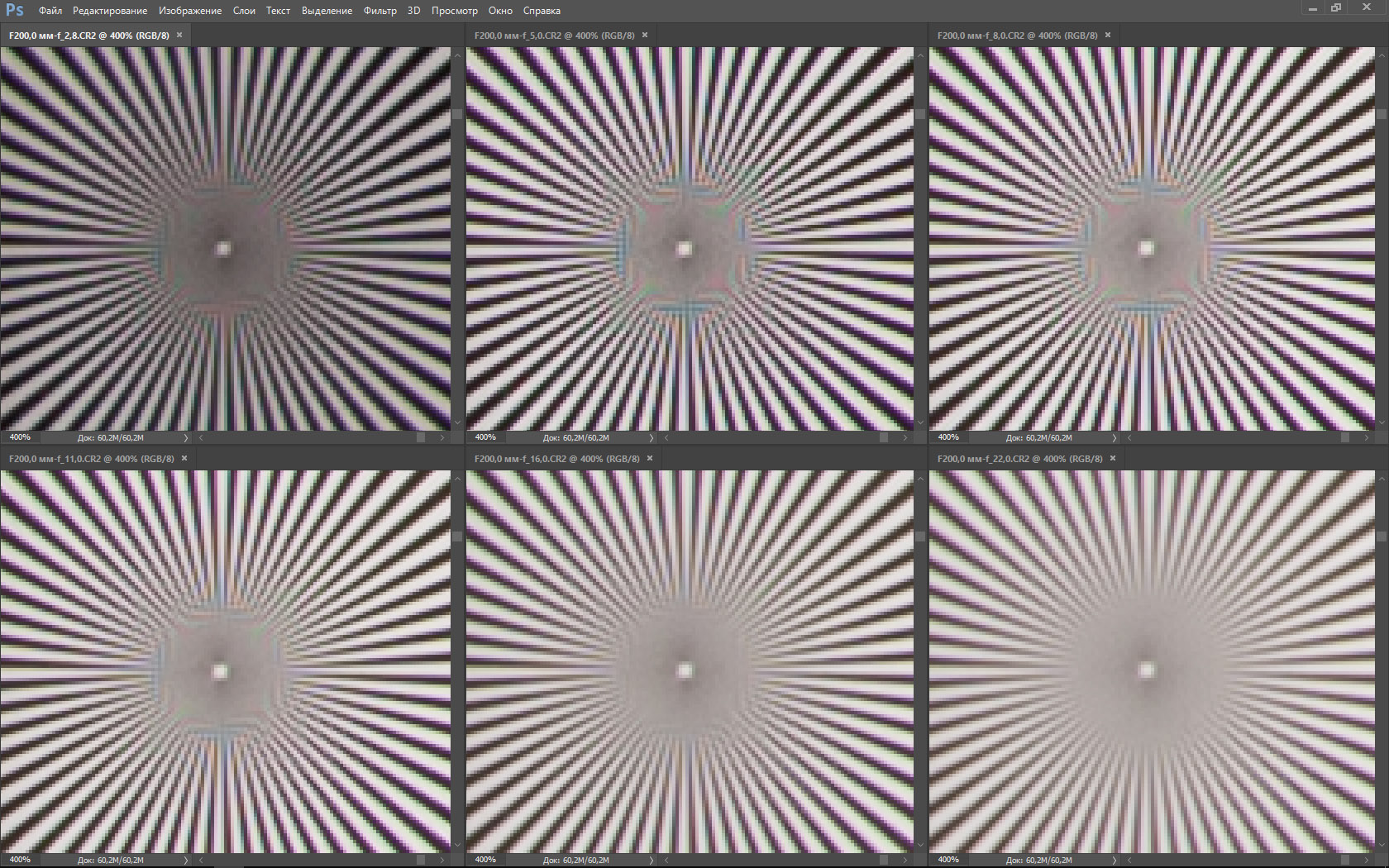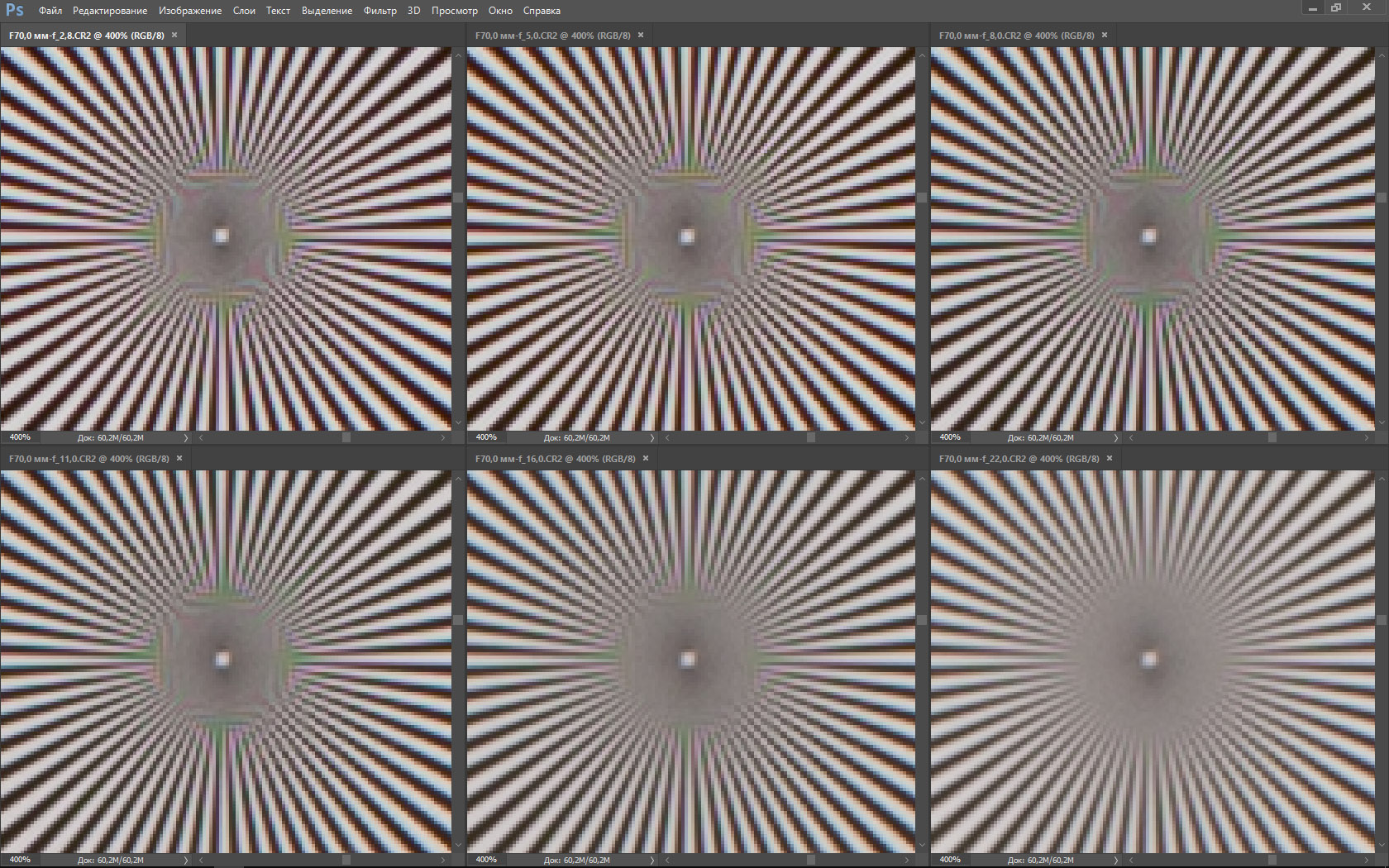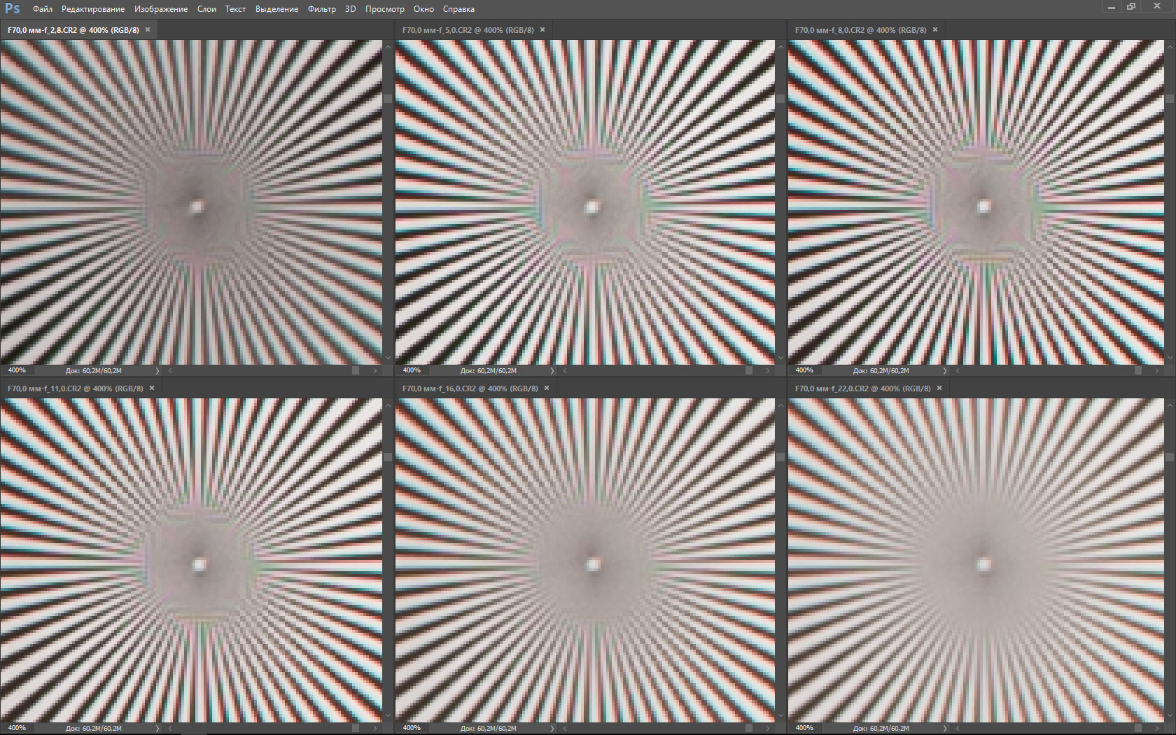 | На всех скриншотах верхний ряд: f/2,8 — f/5,0 — f/8,0, нижний ряд: f/11 — f/16 — f/22 | |||