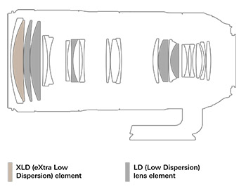 | Оптическая схема | 23 элемента в 17 группах (включая 1 элемент со сверхнизкой дисперсией и 5 элементов с низким коэффициентом дисперсии) |
